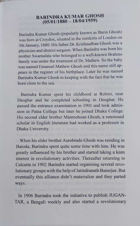 Barindra Kumar Ghosh (popularly known as Barin Ghosh) was born at Croydon, situated in the outskirts of London on 5th January, 1880. His father Dr. Krishnadhan Ghosh was a physician and district surgeon. When Barindra was born his mother Swarnalata who belonged to a well-known Brahmo family was under the treatment of Dr, Mathew. So the baby was named Emanuel Mathew Ghosh and this name still ap- pears in the register of his birthplace. Later he was named Barindra Kumar Ghosh in keeping with the fact that he was born close to the sea.