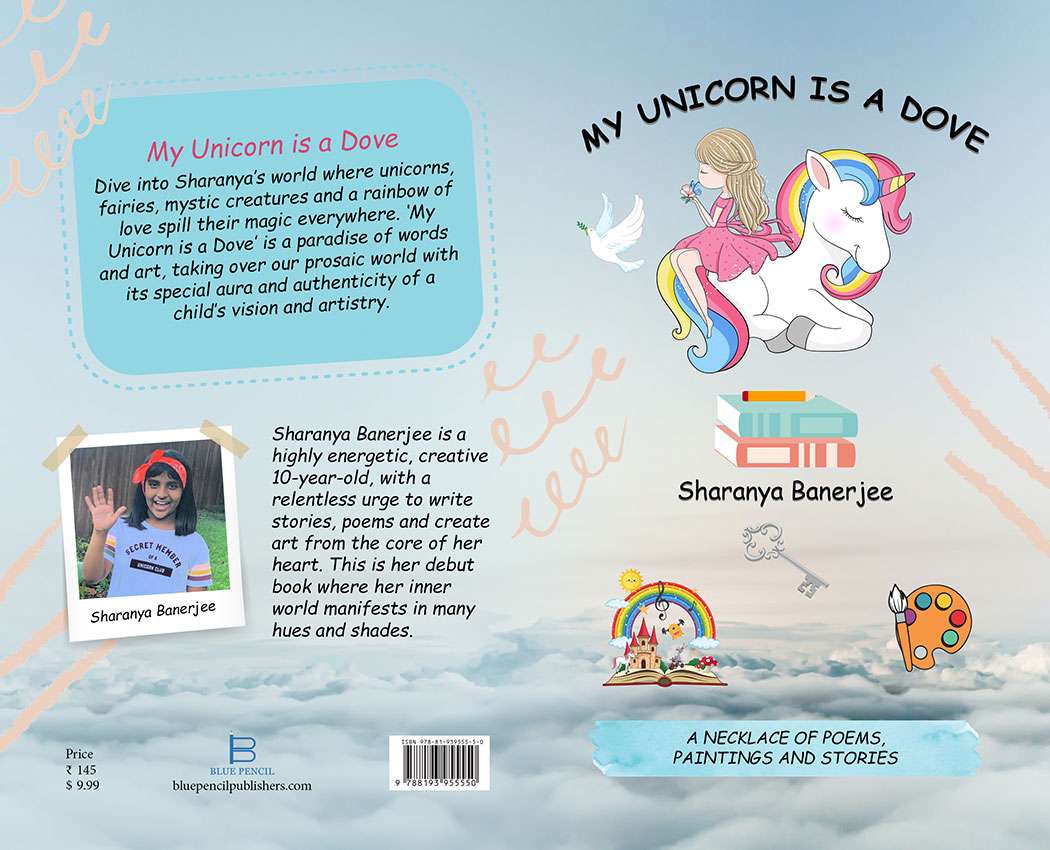 Dive into Sharanya’s world where unicorns, fairies, mystic creatures and a rainbow of love spill their magic everywhere. ‘My Unicorn is a Dove’ is a paradise of words and art, taking over our prosaic world with its special aura and authenticity of a child’s vision and artistry.