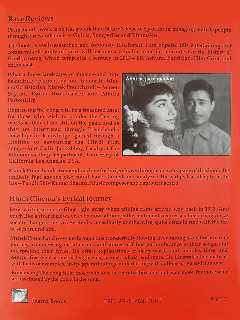 Manek Premchand rows us through this wonderfully flowing river, taking us on this exciting journey, commenting on situations and stories of films with relevance to their songs, and interpreting their lyrics. He offers explanations of deep words and complex lines, and demystifies what is meant by ghazals, nazms, rubais, and more. He illustrates the analysis with loads of examples, and peppers this huge undertaking with dollops of wit and humour.